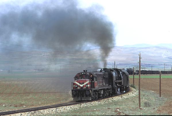 DE21500 piloting a 56000. Dull weather picture but an interesting steam /diesel combination leaving Yolcati for Malatya. The train was grossly overloaded and soon stalled, needing a banker to come and help it to restart. 11 April 1975 |
