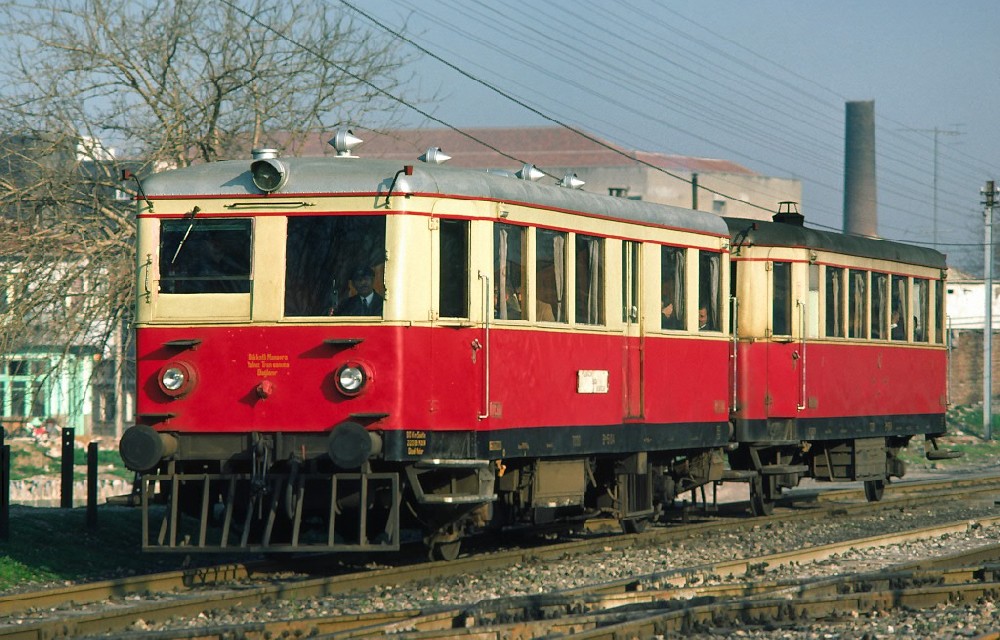 A rare view: a colour picture of a 21 to 25 railcar (in the background). The foreground is a trailer also delivered by MAN in Izmir 6 March 1977 |