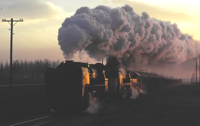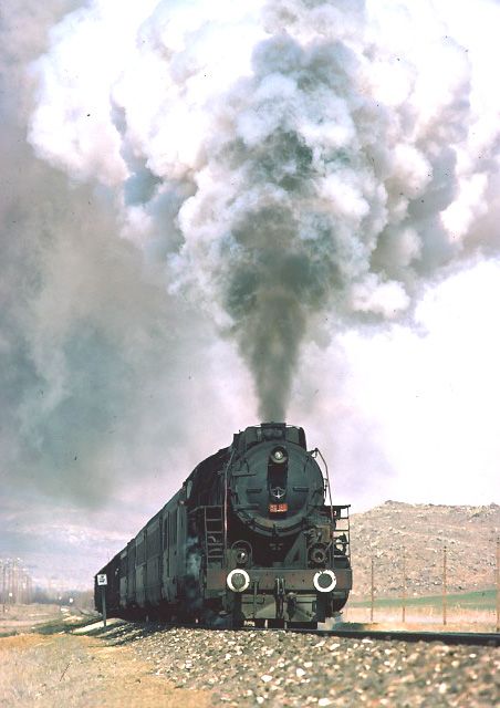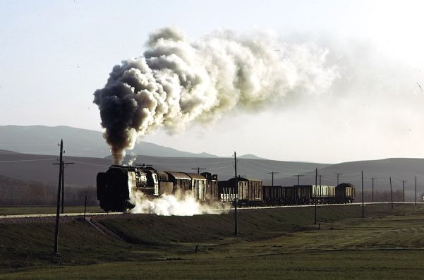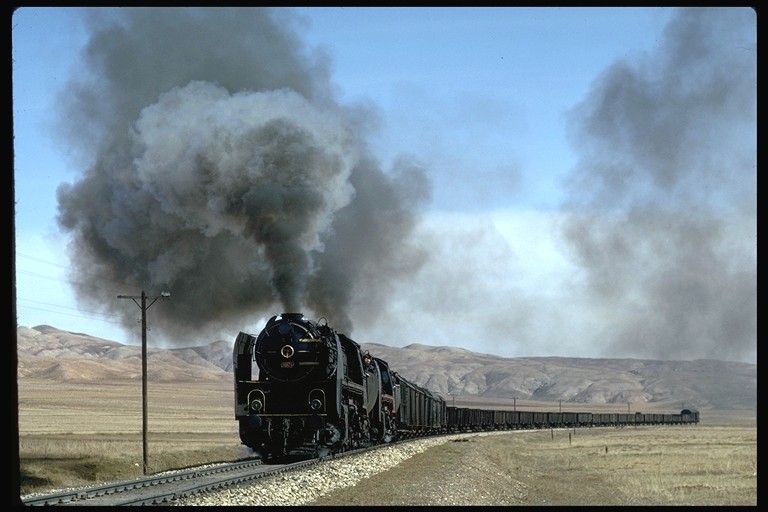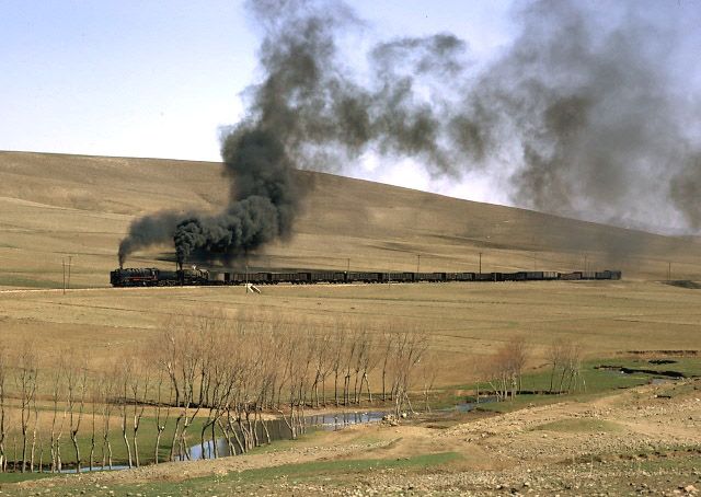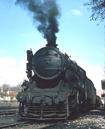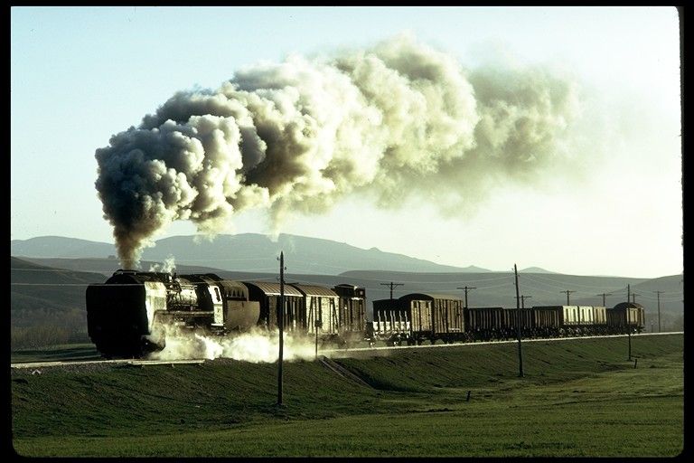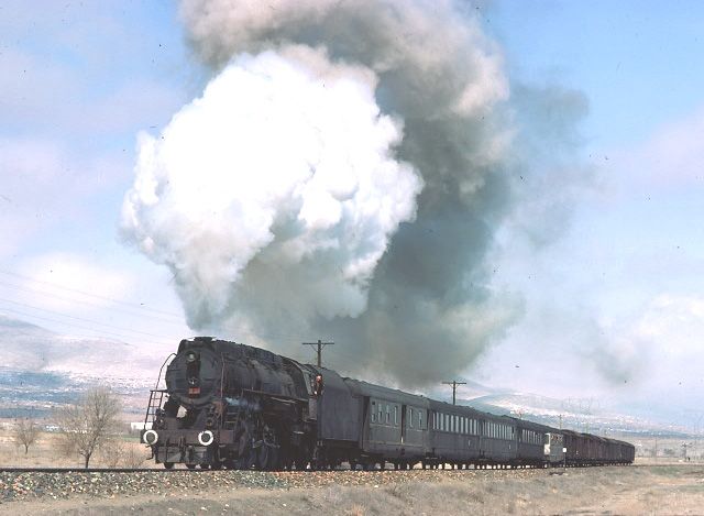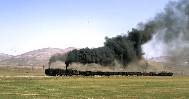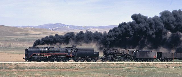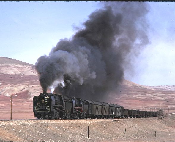 56124+56125 heading for Kayseri from Sivas. 1 April 1974. With the clarity severely impaired due to the proximity of a nearby cement works, our pair of 2-10-0s get under way again after being looped for a diesel hauled passenger train to overtake them |