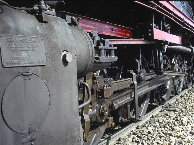56124 close up detail near Tuzla. 1 April 1974. Not long after the last picture was taken, the train broke in two and the whole job ground to a halt whilst the wagons were reconnected. This gave the opportunity for a close up picture showing the fairly unusual position of the loco works plate on the cylinder cover. |