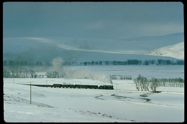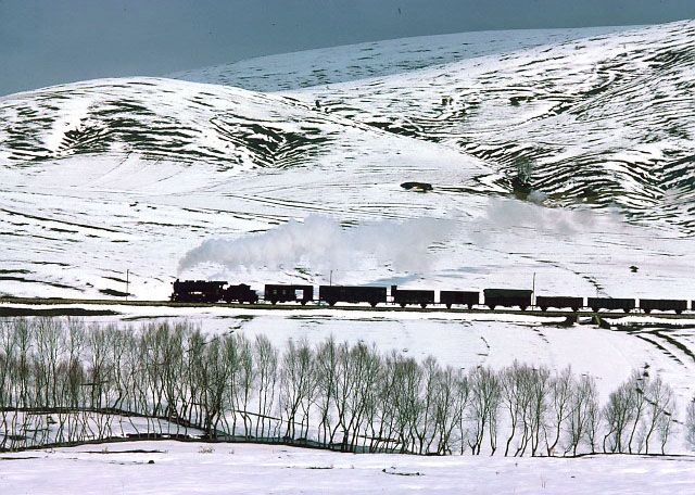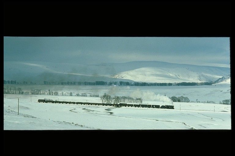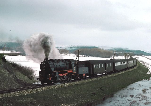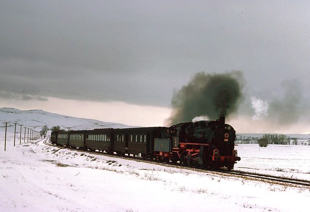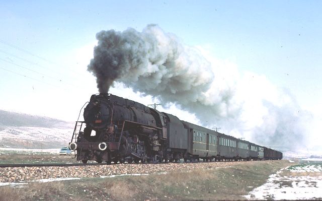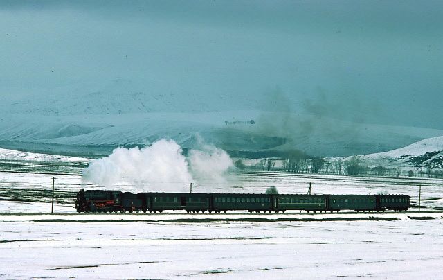 45053 near Kalin 15 March 1977. We ran into very poor road conditions near Kalin and were very surprised to catch up a freight train ahead of the passenger we saw leaving Sivas |