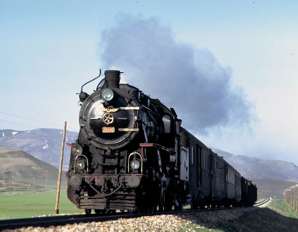 45042 west of Yildizeli 9 April 1975. The overnight Samsun to Sivas passenger train in the last hour of its 13 hour journey |