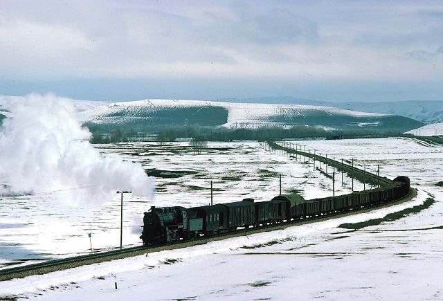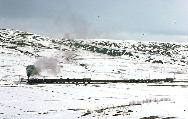 56362 between Kayseri and Niğde 11 March 1977. Bit of a boring line photographically since the road and railway ran parallel for many miles with telegraph poles to contend with as well |