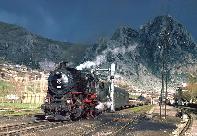 17980 45021 at Amasya 15 March 1977. At Amasya we found a southbound train and some dramatic lighting |