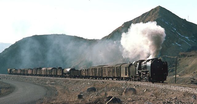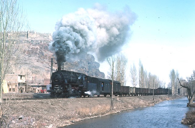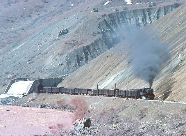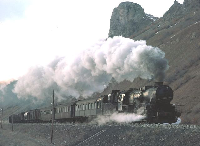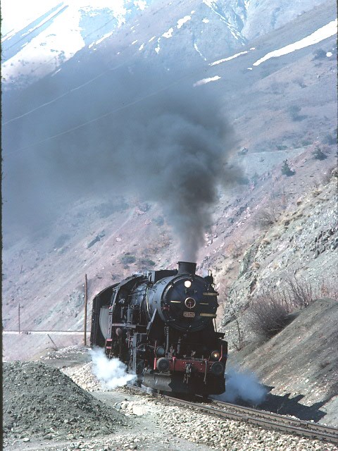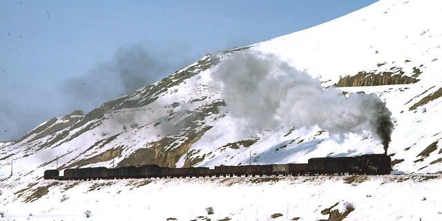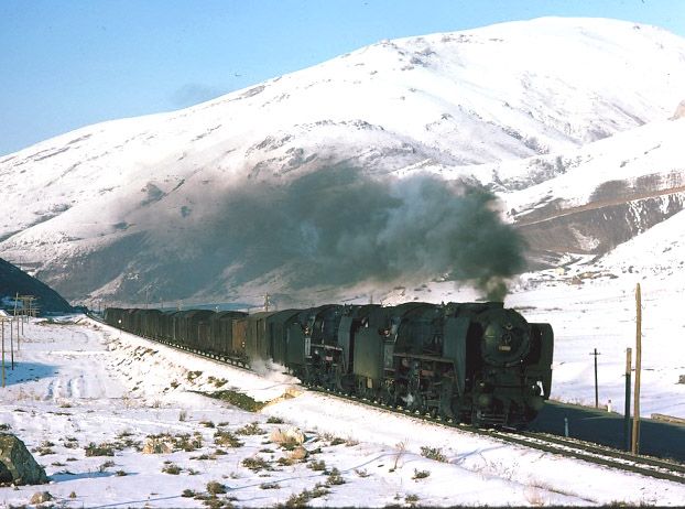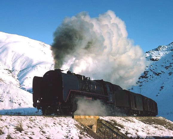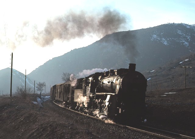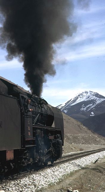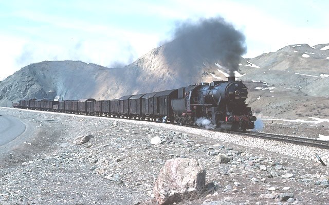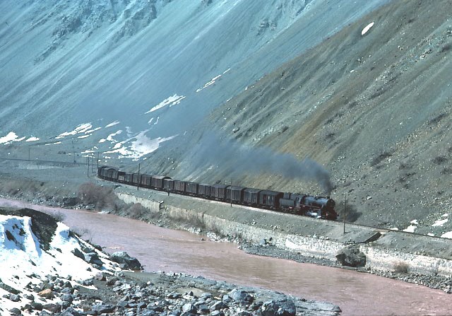 45055 east of Erzican 26 March 1976. Towards the end of the day we were heading west from Erzurum when we came across this eastbound Nohab 2-8-0 climbing through the Euphrates gorge |
