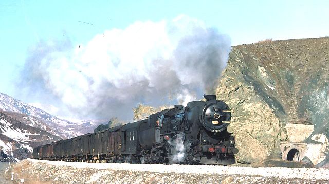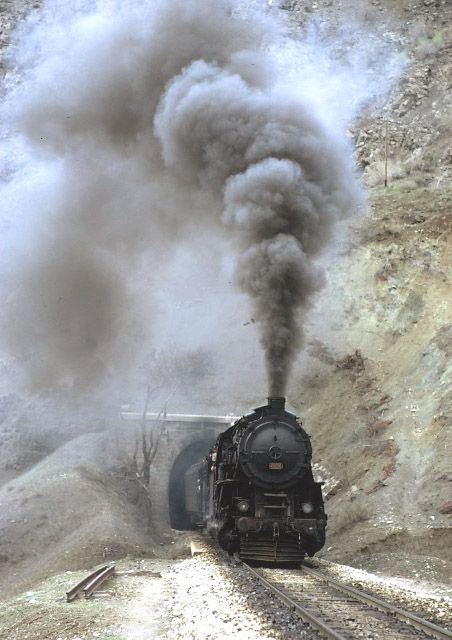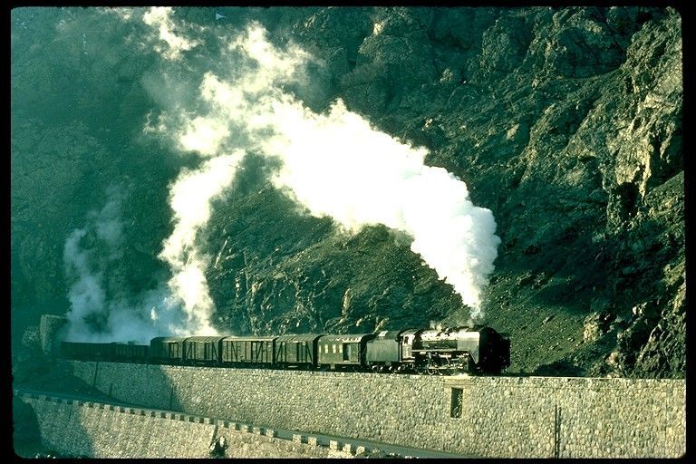 56067 between Tanyeri and Demirkapı 14 March 1977. Bursting out of the second tunnel the train is really struggling. Anybody know the gradients on this section? |