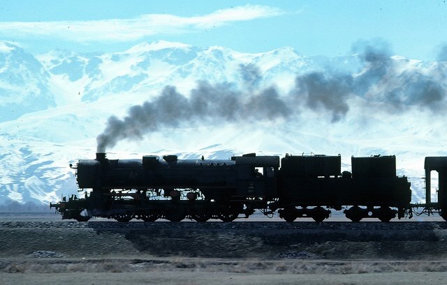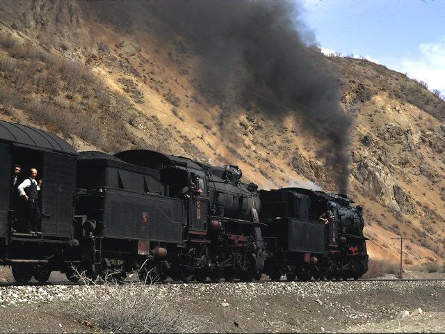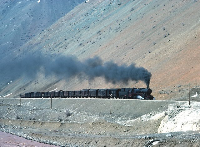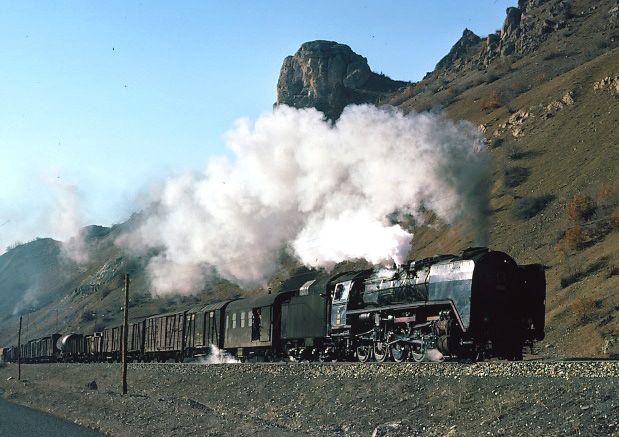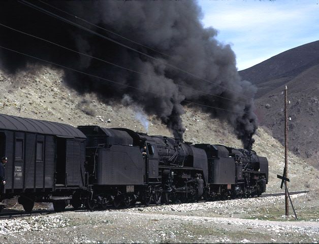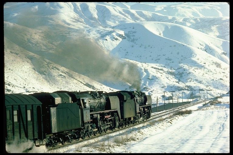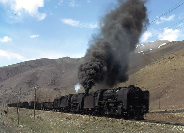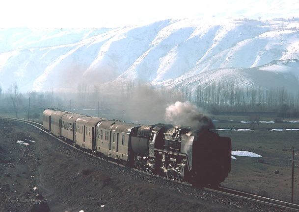 45036+45000 east of Erzincan 10 April 1975. The side on shot shows that one loco is an oil burner whilst the other is a coal fired loco, very strange since I had been led to believe that coal fired locos were in the west and oil fired were in the east. Does anybody know why a coal-fired loco should have been heading so far east? |