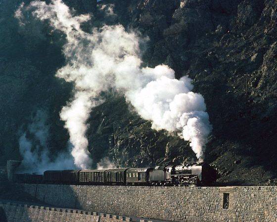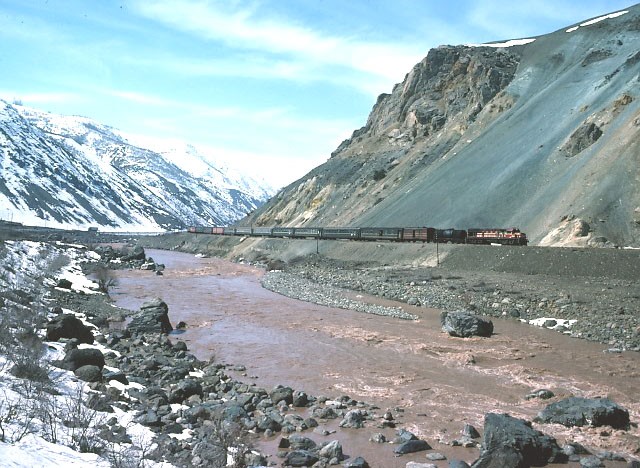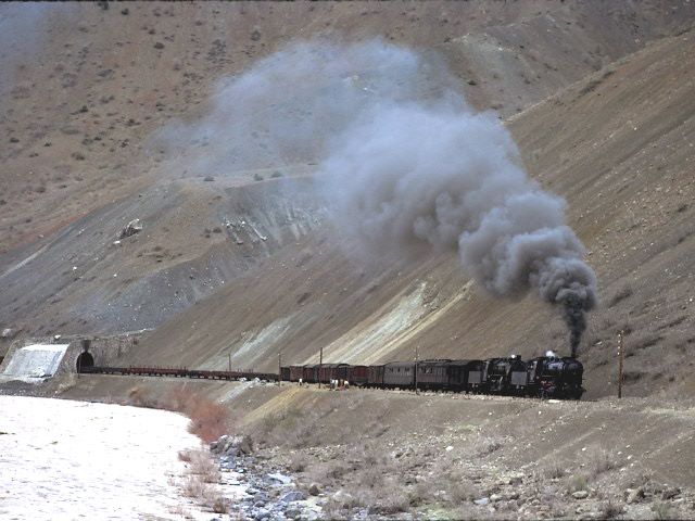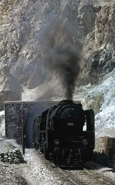 45036+45000 east of Erzincan 10 April 1975. A final shot of this train blasting out of one of the tunnels towards the top of the gorge |