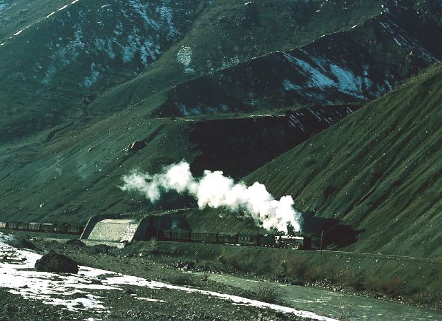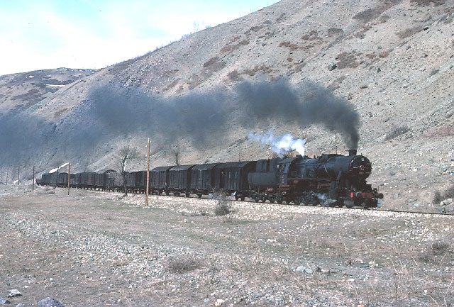 45036+45000 east of Erzincan 10 April 1975. The two 2-8-0 locos had to work really hard on this section |