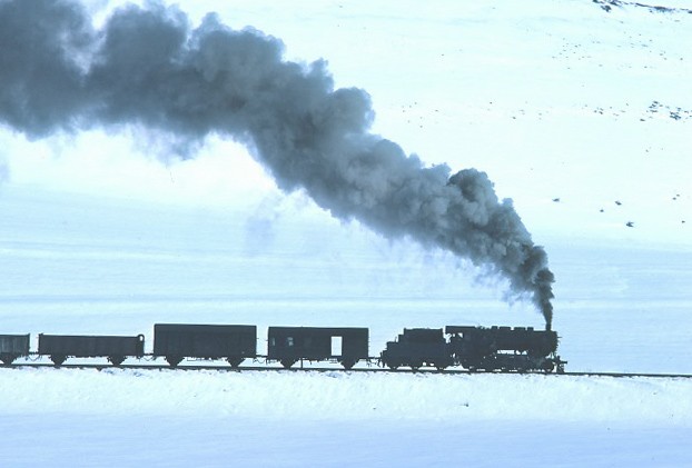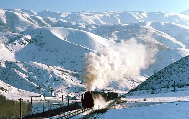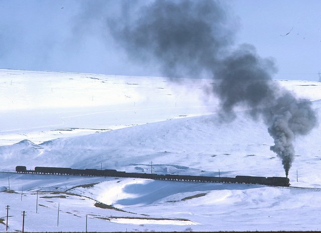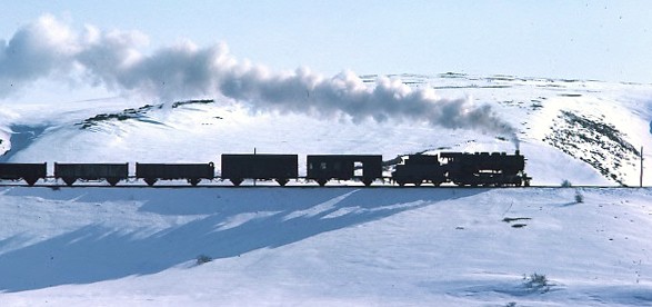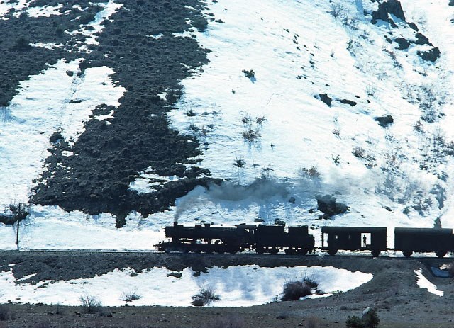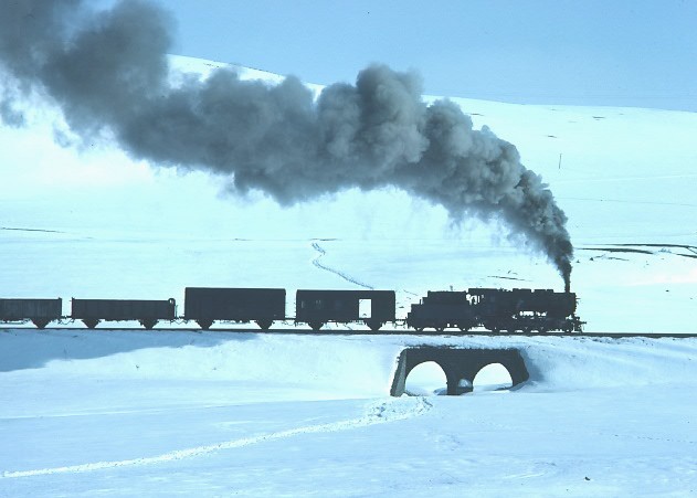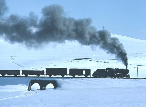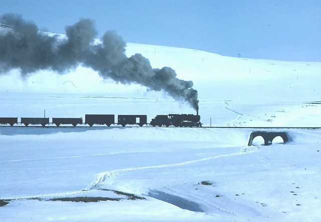 56542 east of Erzincan 27 March 1976. Silhouetted against the snow, the two oil tanks are clearly visible in the tender |