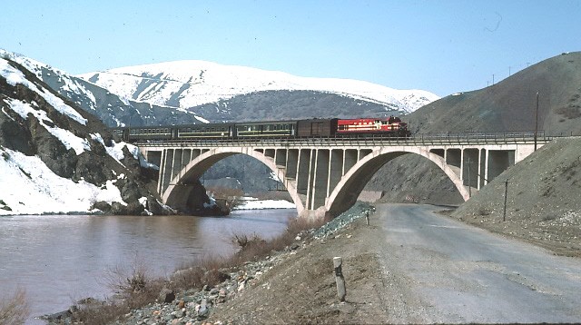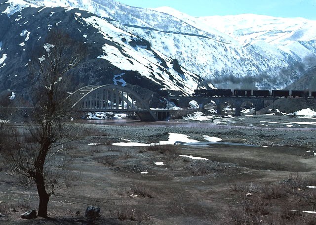 56542 near Demirkapı 27 March 1976. Crossing the Euphrates the railway comes onto our side of the valley |
