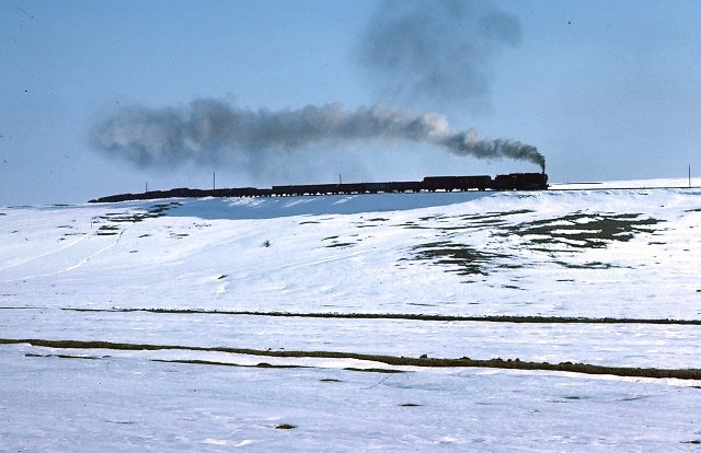 56067 east of Demirkapı 14 March 1977. The hills are now a distant image as the train heads east for Erzurum |