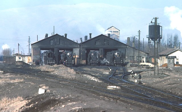 Locos on Erzincan shed 10 April 1975. Back down at Erzincan we waited near the shed for another train up the gorge. But it was not to be, so this was the last shot of the day, since we were wary of going too near the shed for fear of being arrested, since we had had a problem at Çankiri earlier on in the trip. |