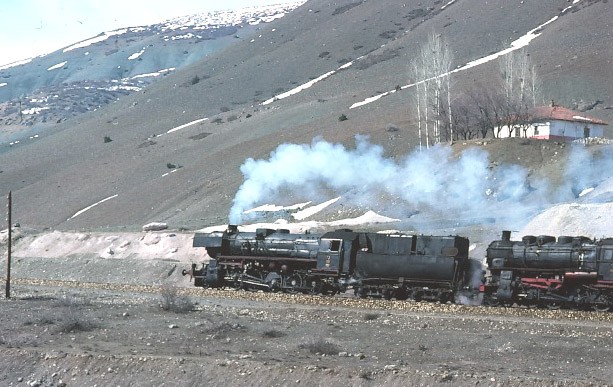 56016 and another Henschel 2-10-0 head downhill towards Erzincan photographed east of Demirkapı 14 March 1977 |
