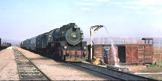 46214 leaving Çağlar 13 March 1977. Having replenished the tender tank the train gets under way again |